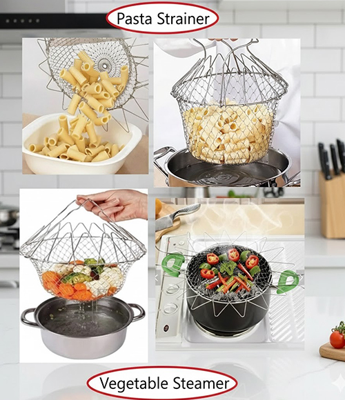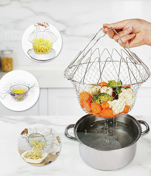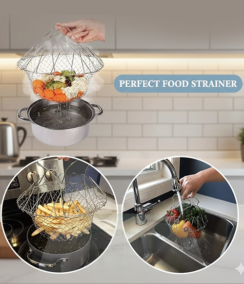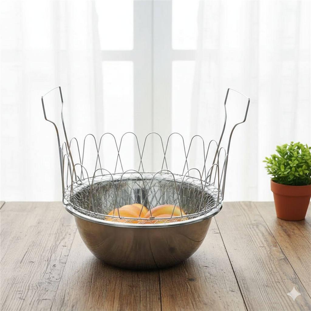 Experience effortless cooking with the Chef Basket Deluxe, a versatile foldable wire basket designed to steam vegetables, strain pasta, deep-fry snacks, and rinse foods directly from pot to plate. Crafted from durable solid steel, it opens into a spacious basket and folds flat for easy storage. Dishwasher-safe and heat-resistant, this multi-purpose kitchen essential saves time, reduces mess, and simplifies everyday cooking.